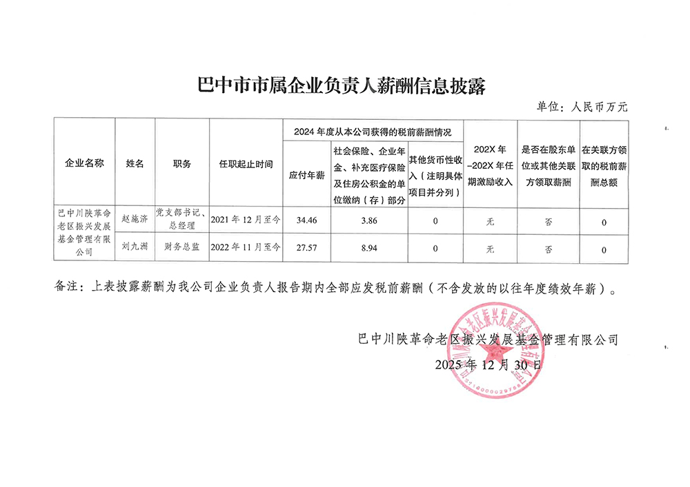 巴中市市屬企業(yè)負責人薪酬信息披露